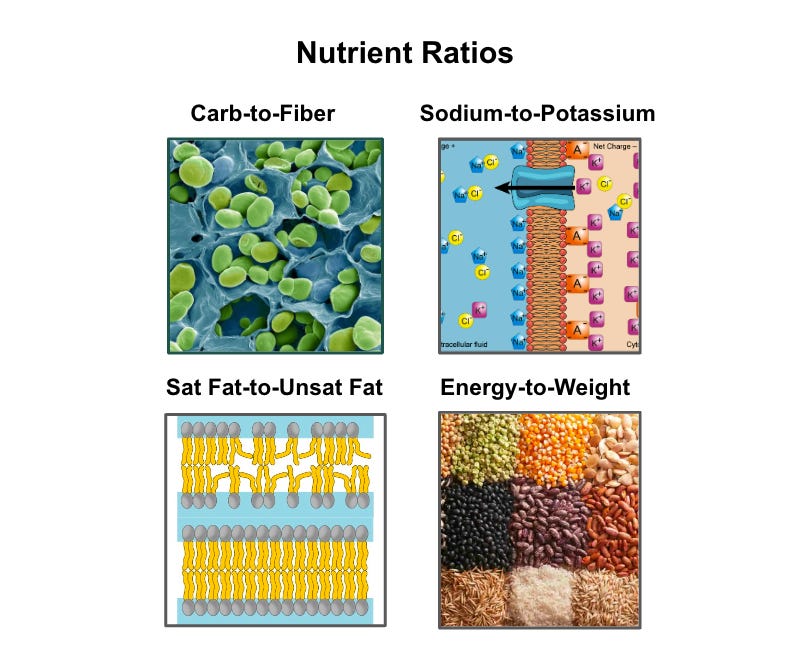 Ratios such as carbohydrate to fiber, saturated to unsaturated fat, and sodium to potassium, and energy to weight begin to reflect this deeper structure. They capture quality within categories and balance across them. These relationships also align more closely with how the gut microbiome interprets diet, responding not to isolated nutrients but to the overall pattern of inputs that arrive together and shape its function.