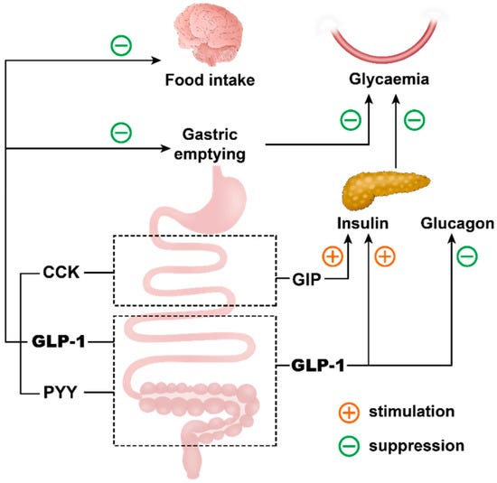 When nutrients reach the lower small intestine (the ileum) and colon, they trigger feedback signals that slow stomach emptying and appetite. Specialized cells release hormones such as GLP-1 and PYY that signal through the vagus nerve to the brain. Together these signals slow digestion and help limit further intake.
