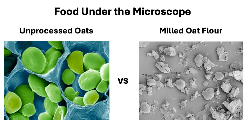 Minimally processed foods retain structural complexity such as plant cell walls, intact fibers, and resistant starches. These structures slow digestion and allow portions of food to travel further down the intestine before absorption.