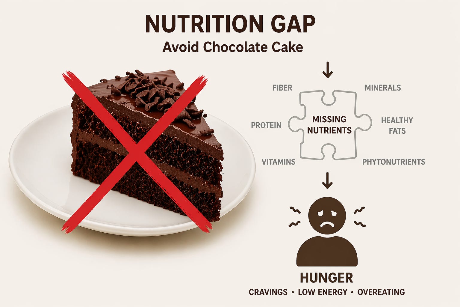 Consider chocolate cake on its own. It is energy dense and high in refined carbohydrate and fat, while providing very little fiber or micronutrient density. This creates imbalance across key nutrient relationships such as carbohydrate to fiber and calories to weight. It is also easy to over consume because it delivers energy without strongly engaging satiety pathways.