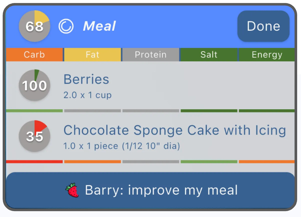 Smart Bites allows you to scan foods, score meals, and track how combinations influence overall balance. Barry, the in-app assistant, suggests complementary additions that can improve what you are already eating.