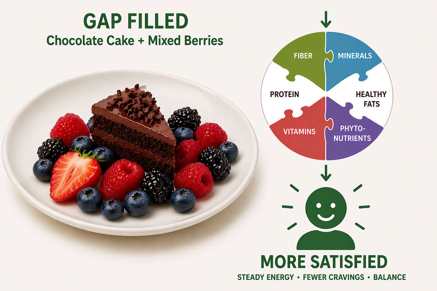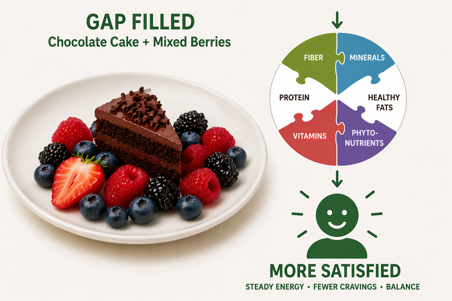 Reducing the portion of cake and adding a generous serving of mixed berries lowers simple carbohydrates and saturated fats while adding fiber, micronutrients, and a wide range of healthy plant compounds. Fiber, and plant compounds help slow digestion and enhance gut–brain signaling pathways that regulate fullness.